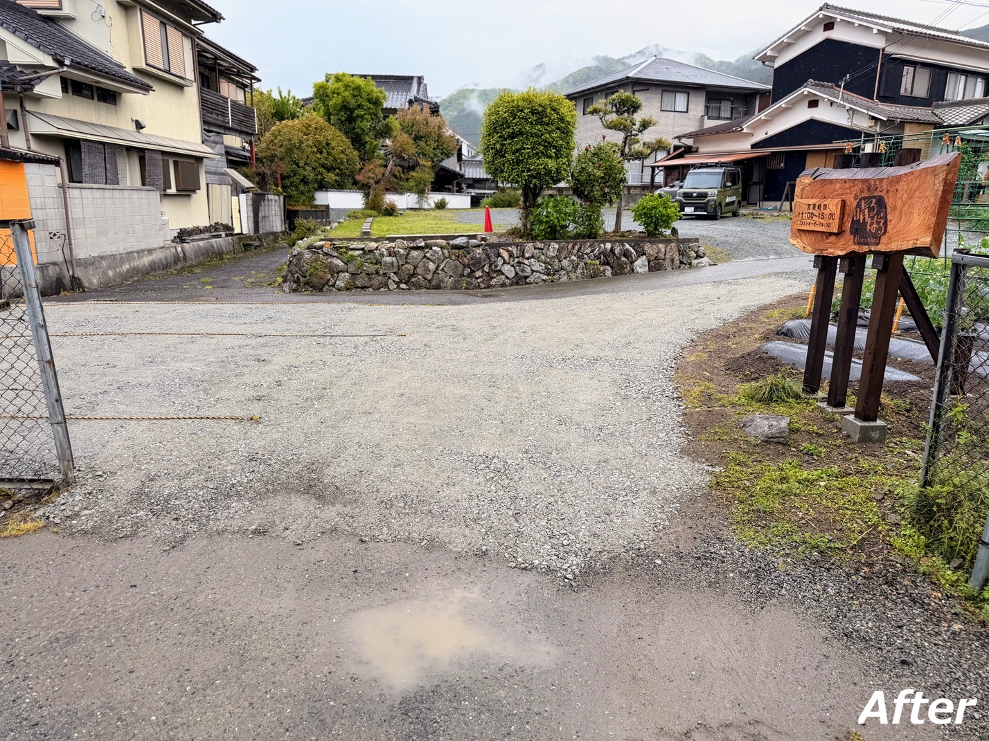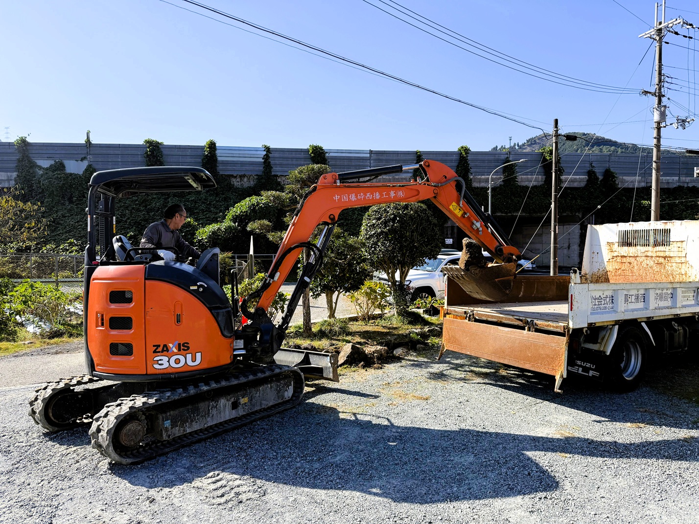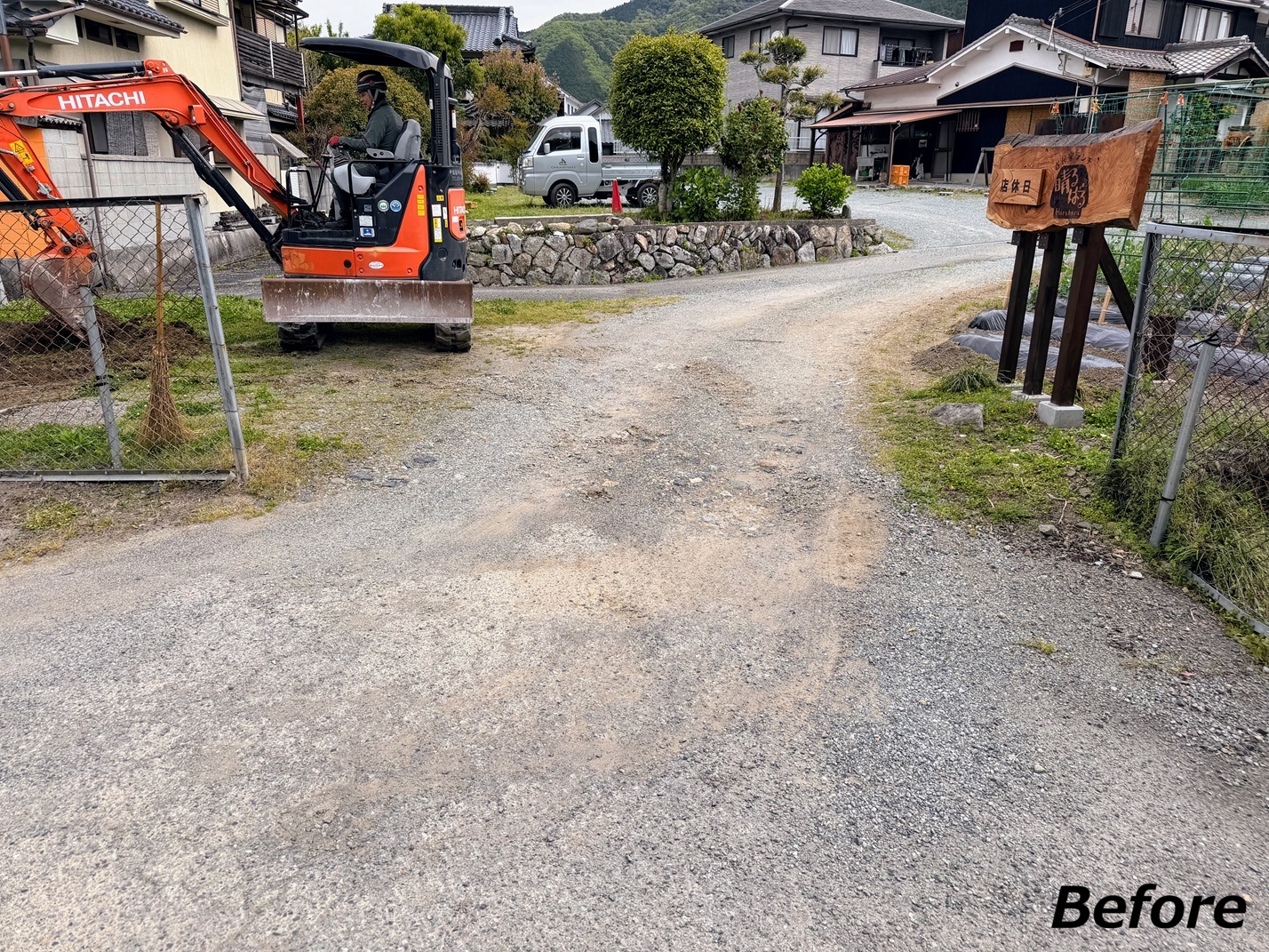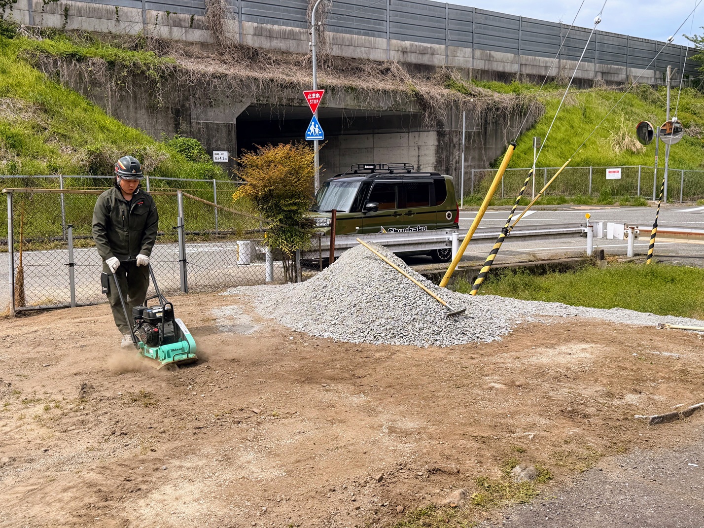 表土剥ぎ→転圧→駐車場向けの砕石荷下ろし→表土積込→砕石敷き均し→転圧の順に作業していきます。